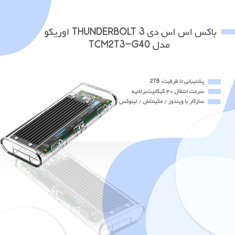 در دنیای امروزی که سرعت در نقل و انتقالات اطلاعات جز اهمیتهای سیستمی و کامپیوتری است میتوان برای رفع این مشکل از باکس اس اس دی Thunderbolt 3 اوریکو مدل TCM2T3-G40 استفاده کرد. این باکس دارای طراحی شفافی است که آن را زیباتر میکند و شما میتواند قطعات داخل را ببینید این باکس اس اس دی دارای پورت Thunderbolt 3 و تراشه JHL6340 است که میتواند اطلاعات شما را تا سرعت ۴۰ گیگابیتبرثانیه انتقال دهد. بدنه این قاب منحصر به فرد از جنس PC شفاف است و بهجز مقاومت و زیبایی دارای دارای درب کشویی هم است. باکس اس اس دی Thunderbolt 3 اوریکو مدل TCM2T3-G40 دارای درگاه خروجی USB-C بوده تا بتواند این سرعت بالایی انتقال اصلاعات را پشتیبانی کند. این باکس میتواند تا ظرفیت ۲ ترابایت را پشتیبانی کند و با سیستمعاملهای ویندوز، مکینتاش و لینوکس کاملا تبادل دارد.باید به این توجه شود که این قاب برای SSDهای NVMe M.2 مناسب است.