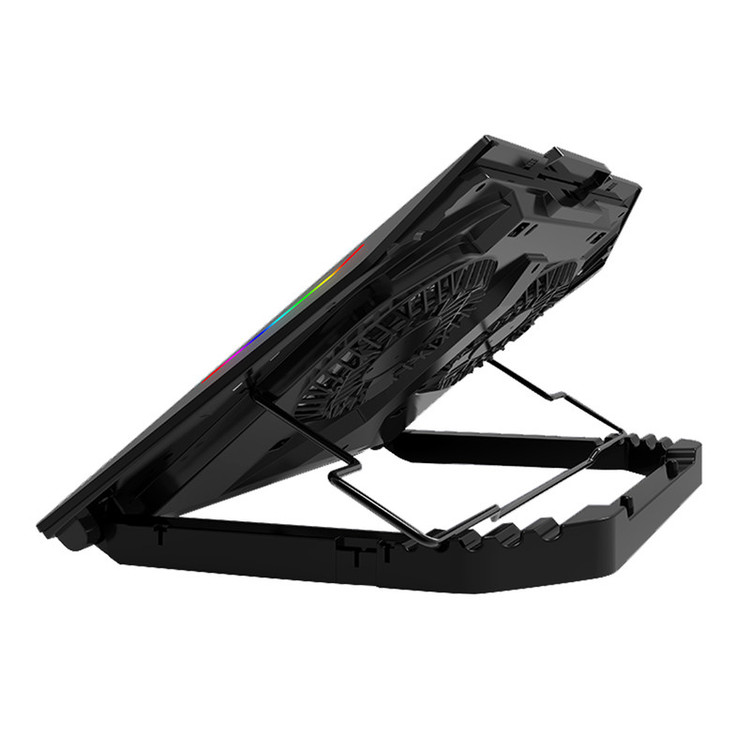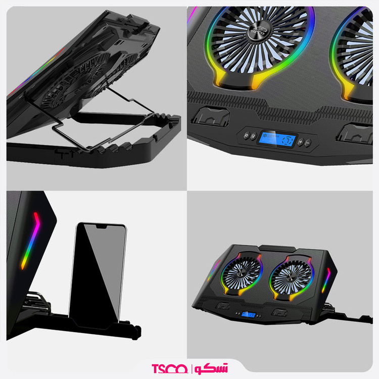 دارای دو فن 6 سرعته ی 125 میلی متری (ماکزیمم سرعت 1450RPM) 7 حالت RGB پنج حالت تغییر ارتفاع دارای هولدر موبایل دارای 2 پورت USB و نمایشگر دارای کابل USB