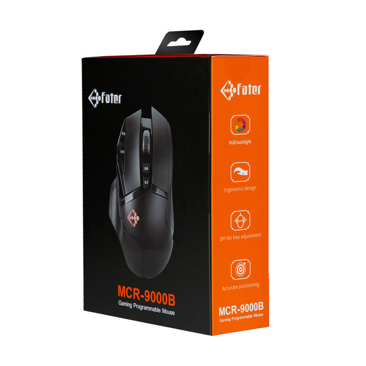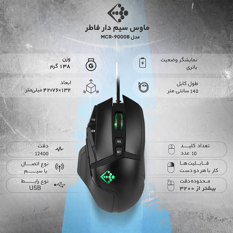 ماوس فاطر مدل MCR-9000B از جمله ماوسهای گیمینگ برند فاطر با تکنولوژی سطح بالا و بروز است که به سبب ویژگیهایی که در ساختار آن در نظر گرفته شده، یکی از کم رقیبترین ماوسها در بازار محسوب میشود. این ماوس از انواع موسهای گیمینگ و کابلی است که به وسیله کابل پرسرعت با روکش کولار، به سیستم متصل میشود. اتصال کابل از طریق درگاه USB حاصل میشود و طول این کابل 175 سانتی متر است. ویژگی مطرح دیگر برای ماوس مذکور، در رابطه با DPI قابل تنظیم آن است. دقت کم نظیر 12400 دی پی آی، این موس را به یکی از دقیق ترین مدلهای ساخته شده در جهان مبدل کرده است. همچنین کاربر میتواند به راحتی بر اساس نیاز خود این دقت را بروی اعداد 1000، 2000، 3000، 4000، 6200 و یا 12400 تنظیم کند. طراحی مدرن و ارگونومیک و همچنین داشتن نرمافزار فارسی با قابلیت اضافه کردن ماکرو برای کلیدها به راحتی میتواند نظر گیمرها و طراحان و کاربران حرفهای را به خود جلب و آنها را مجذوب خود کند. تعداد دکمههای موجود در این مدل، 10 عدد است که هر کدام برای عملکردی متفاوت در روند بازی مورد استفاده قرار میگیرند و میتوانند فرایندهای مربوط به گیم را سادهتر کنند. Couch، Reloading (تعویض خشاب)، Ducking (جا خالی دادن)، Sprinting (دویدن)، Weapon switching (تعویض اسلحه) و Crouching (نشستن)، نمونههایی از کاربردهای کلیدهای جانبی ماوس گیمینگ هستند. همچنین کاربردهای عمومی چون کلیک راست، کلیک چپ، زیاد کردن صدا، کم کردن صدا، پخش یا توقف موسیقی، بستن صفحات مرورگر، باز کردن صفحه جدید، جابجایی بین صفحات مرورگر، باز کردن یک اپلیکیشن، کپی/پیست کردن و پرینت اسکرین هم از دیگر عملکردهای تعریف شده برای کلیدهای مختلف ماوس گیمینگ هستند. دارابودن نمایشگر وضعیت باتری، ، نورپردازی RGB و قابلیت کارکردن با هر دو دست بدون در نظر گرفتن دست تخصصی، از دیگر ویژگیهای ماوس فاطر مدل MCR-9000B است.