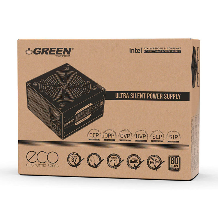 پاور به دلیل تامین انرژی مورد نیاز قطعات یکی از مهمترین اجزا کیس به شمار می رود. پاور GP500A-ECO یکی از تولیدات شرکت گرین بوده که از نوع غیر ماژولار و در فرم فاکتور Rev3.1 تولید شده است. طراحی بهینه سازی شده و برخورداری از متریال و قطعات باکیفیت باعث شده تا منابع تغذیه سری ECO گرین حتی در دمای محیط ۴۰C درجه سانتی گراد نیز امکان ارائه خدمات با بهترین کیفیت را داشته باشند. کانکتور مادربرد این محصول دارای ۲۰+۴ پین است. این پاور دارای توان حداکثر ۵۰۰ وات و گواهینامه استاندارد ۸۰PLUS با راندمان حداکثر ۸۶ درصد می باشد که همین امر باعث کاهش تلفات مصرف انرژی، کاهش حرارت و در نتیجه عملکرد کاملاً بی صدا این سری شده است. Green GP500A-ECO مجهز به یک کانکتور ۴+۴ پین E-ATX / ATX، دو کانکتور ۲+۶ پین PCI-E، چهار عدد کانکتور ۱۵ پین SATA، چهار عدد کانکتور ۴ پین Molex می باشد. ویژگی محوری پاورهای سری ECO گرین، نسبت فوقالعاده کارایی آنها در برابر قیمت محسوب می شود. در واقع این سری، آن دسته از کاربرانی را هدف گرفته که حتی با بودجه محدود، قصد خرید یک پاور استاندارد با گارانتی و خدمات پس از فروش معتبر را دارند.