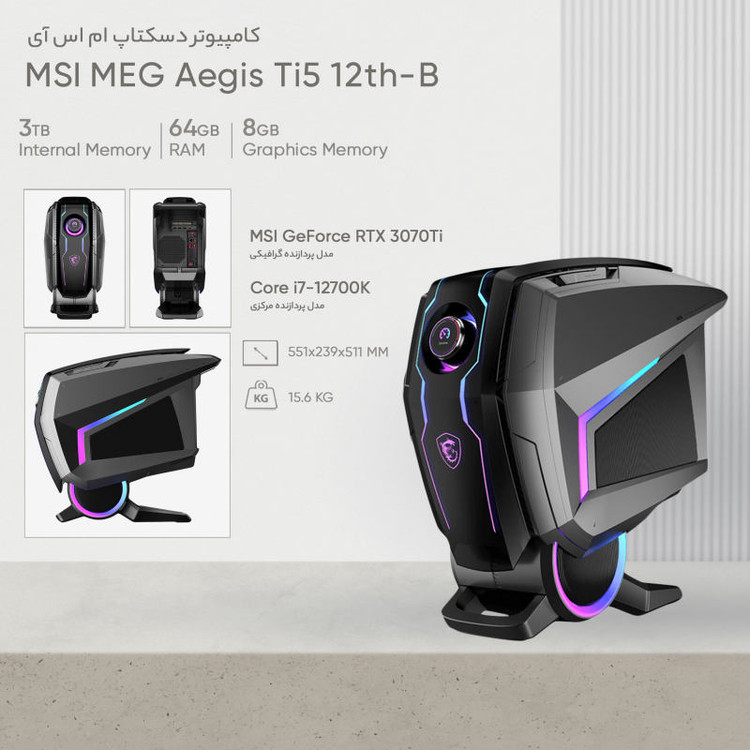 کامپیوترهای دسکتاپ شرکت ام اس ای همواره به عنوان یکی از زیباترین و قدرتمندترین کامپیوترهای موجود در بازار شناخته میشوند. امروزه نسل جدیدی از این کامپیوترها با نام MEG Aegis Ti5 12TH عرضه شده است و به واسطهی زیبایی ظاهری و قدرت خارقالعادهاش میتواند هر گیمری را به سمت خود جذب کند. این کامپیوتر علاوه بر مشخصات ظاهری چشمگیر، از پردازندهی مرکزی قدرتمند شرکت اینتل سری i7 و مدل 12700K بهرهمند است. همچنین، شرکت ام اس آی برای این کامپیوتر میزان 64 گیگابایت رم DDR5 با سرعت فوقالعادهی 4800 مگاهرتز در نظر گرفته است. پردازندهی گرافیکی این کامپیوتر ساخته شده توسط شرکت انویدیا با مدل MSI GeForce RTX 3070Ti است که میتواند به راحتی تا سالهای سال سنگینترین بازیهای ویدیویی را با بالاترین تنظیمات گرافیکی ممکن اجرا کند. بهرهگیری این کامپیوتر از 3 ترابایت حافظهی هیبریدی (یک ترابایت SSD و دو ترابایت HDD) میتواند دارندگان آن را از این نظر هم بینیاز کند.