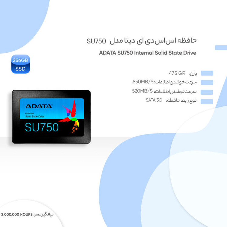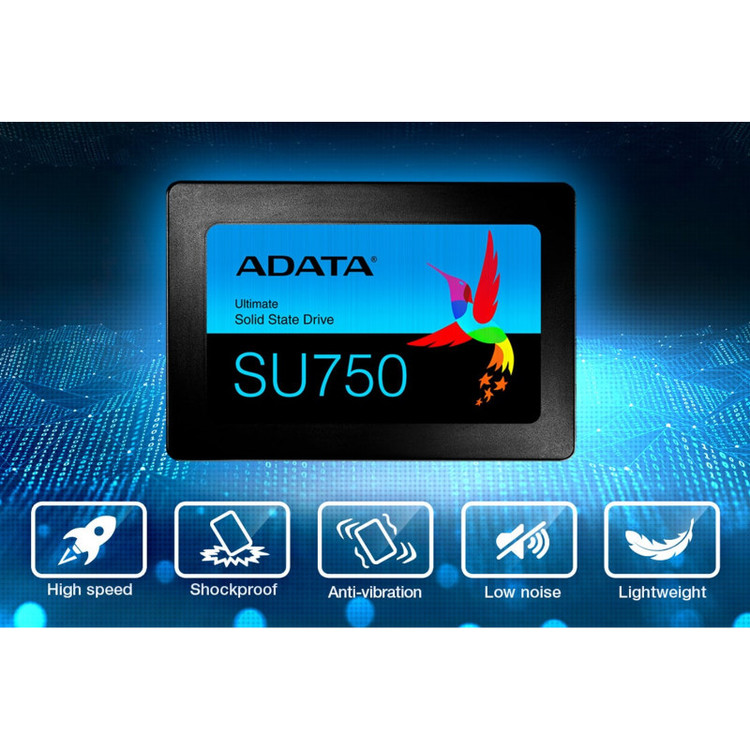 اساسدی «SU750» محصولی از برند «ای دیتا» (ADATA) است. فرم فاکتور این حافظه 2.5 اینچی است که بهراحتی میتوان آن را جایگزین هارددیسک لپتاپ کرد. حافظههای SSD برخلاف هارددیسکها برای انجام پردازشهای مربوط به ذخیرهسازی اطلاعات از هیچ قسمت حرکتی استفاده نمیکنند. این موضوع باعث مقاومت آنها دربرابر شوک میشود. در این محصول از حافظههای 3D NAND استفاده شده که در مقایسه با NAND دوبعدی، پایداری و سرعت بیشتری دارند. این محصول از شرکت ای دیتا از فناوریهای SLC Caching و DRAM Cache Buffer پشتیبانی میکند و به مدد استفاده از این فناوریها سرعت خواندن و نوشتن در آن، حداکثر به 550 مگابایت بر ثانیه و 520 مگابایت بر ثانیه میرسد. چنین سرعتی در مقایسه با هارددیسک سنتی بهمراتب سریعتر است و با استفاده از آن میتوان سیستمعامل و بازیهای کامپیوتری را سریعتر لود کرد. با پشتیبانی از فناوری اصلاح خطای LDPC ، این محصول میتواند خطاها را شناسایی و آنها را اصلاح کند. حافظه اساسدی «SU750» توانسته است گواهینامههای CE، FCC و ROHS را هم کسب کند.
