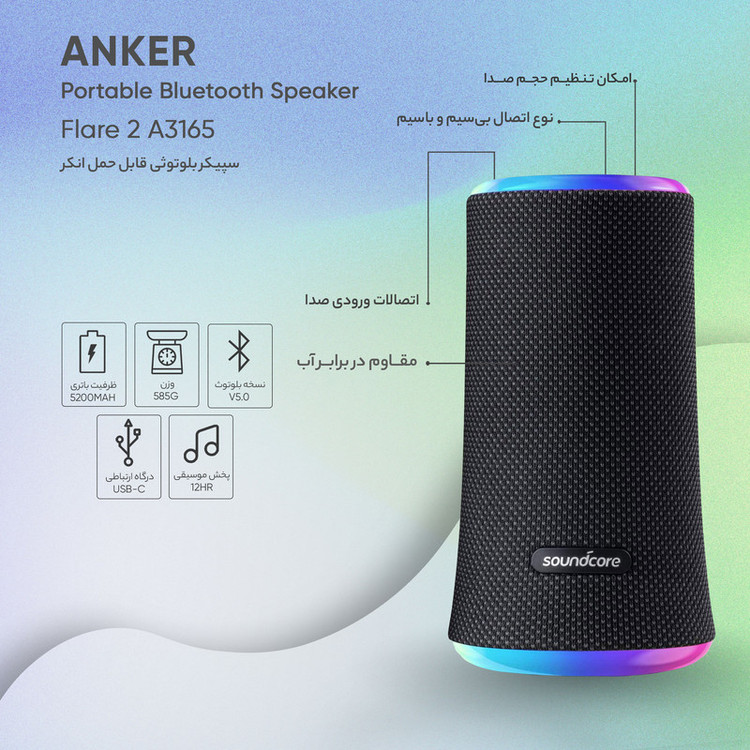 لذت گوش دادن به موسیقی همیشه غیر قابل توصیف بوده و هست. حال آنکه امروزه موسیقی جزوی از زندگی همه افراد شده و در تمام لحظات، چه در زمان کار و چه استراحت به موسیقی گوش میدهند. اسپیکر بلوتوثی انکر، توان خروجی صدای 20 وات را دارد؛ این بدان معناست که در یک اتاق با مساحت 30 مترمربع و یا حتی بیشتر صدا به تمام نقاط با وضوح میرسد. این اسپیکر با داشتن باتری 5200 میلیآمپر ساعت میتواند به مدت 12 ساعت بیوقفه به پخش موسیقی بپردازد. از ویژگیهای قابل توجه این اسپیکر میتوان به قابلیت ضدآب بودن آن اشاره کرد؛ یعنی شما میتوانید این اسپیکر را حتی با خود به حمام ببرید. انکر در طراحی اسپیکر مدل Flare 2 A3165 خود، نور LED در قسمت انتهایی قرار داده، که این نور به شکل رنگین کمان بوده و زیبایی و جلوه خاصی به اسپیکر میدهد. شما میتوانید با نصب نرمافزار مخصوص این اسپیکر تمام این نور و قابلیتها را بصورت اختصاصی تغییر دهید و مطابق با سلیقه خود کنید.