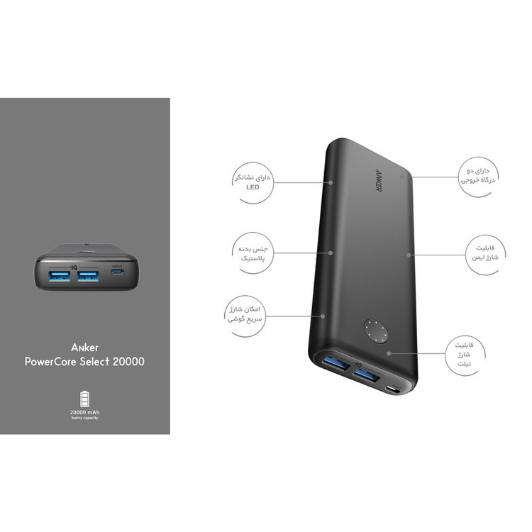در دورهای از تاریخ که ما زیست میکنیم، نیاز به انرژی خصوصا انرژی الکترونیکی و الکتریکی بسیار مهم و حیاتی است. این نیاز برای وسایلی که امروزه دیگر عضوی از زندگی ما هستند به وجود آمده است. شارژر همراه انکر مدل PowerCore Select 20000 شارژر همراهی با ظاهری ساده و مینیمال است. این شارژر ساخته شرکت انکر است که شرکتی بسیار مطرح در زمینه ساخت پاوربانک (شارژرهمراه) است. انکر در تولید این محصولات یک باتری با ظرفیت ۲۰۰۰۰ میلیآمپر ساعت بهکاربرده که قادر است گوشی همراه شما را تا چندین بار شارژ کند. در این محصول از تکنولوژی شارژ سریع Power IQ بهره گرفته شدهاست. همانطور که از نام این تکنولوژی پیداست، شما میتوانید با استفاده از آن باتری گوشی موبایل یا تبلت خود را با سرعت بیشتر از پاور بانکهای معمولی شارژ کنید. ولتاژ ورودی و خروجی در این محصول ۵ ولت و شدت جریان ورودی آن هم ۱.۵، ۲ و ۳ آمپر است. این محصول ۳۸۶ گرم وزن دارد و بدنه آن بهصورت مستطیل طراحی شدهاست. طول این مستطیل ۱۵۰ میلیمتر، عرض آن ۶۹.۴ و ارتفاعش ۲۵ میلیمتر هستند. شرکت تولید کننده برای روشنوخاموش کردن این مدل از سری پاوربانکهای انکر یک کلید طراحی کرده که شما با فشردن آن میتوانید عملیات شارژ باتری دستگاههای خود را آغاز و یا تمام کنید. همچنین روی بدنهی آن چندین نشانگر LED هم وجود دارد که وضعیت باتری پاوربانک را نمایش میدهند.